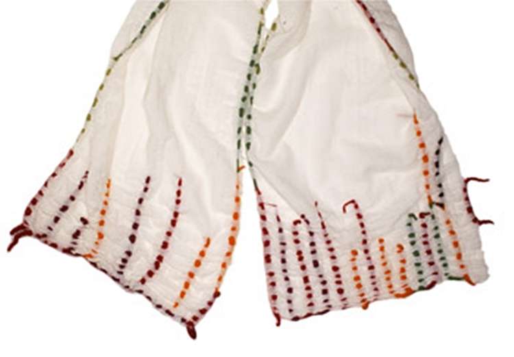 In einen Schalzuschnitt aus Etamine de Laine wurden mit einer dicken Sticknadel verschiedenfarbige Wollfäden eingezogen und dann leicht angefilzt.