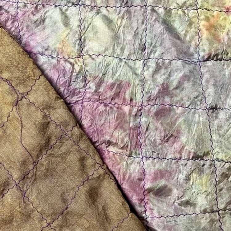 Das Foto oben zeigt den Ausschnit eines Schals noch vor dem Filzen: Oben eine Pongè 5-Seide, darunter ein gefärbter Wolletamine. Zuerst werden beide mit Zick-Zack-Stich verbunden, dann gefilzt. Die Wolle zieht sich zusammen, dadurch entstehen „Blasen“ auf der Seidenseite. Wir haben für unsere Steppschals, die nur wenig filzen sollten, das Schonprogramm mit 30°C (ohne Waschmittel) gewählt. Dieses Programm bewegt den Stoff im Wasser nur sanft, der Etamine schließt sich und bleibt sehr weich.