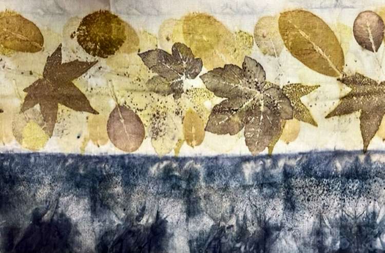 Eukalyptusdrucke leuchten noch mehr, wenn sie auf einem kontrastierenden Hintergrund gedruckt werden (hier Farbtuch mit Deka L, das über den Eukalyptus gelegt und dann gedämpft wurde).