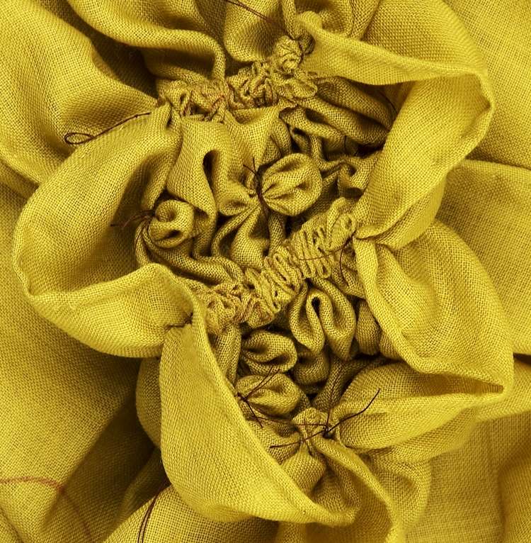 Oben seht ihr das Foto eines „Shibori-Filzes“: Zuerst abgenäht, dann fest zusammengezogen, dann wird das Ganze in der Maschine gefilzt. Die 3D-Muster bleiben dauerhaft.
