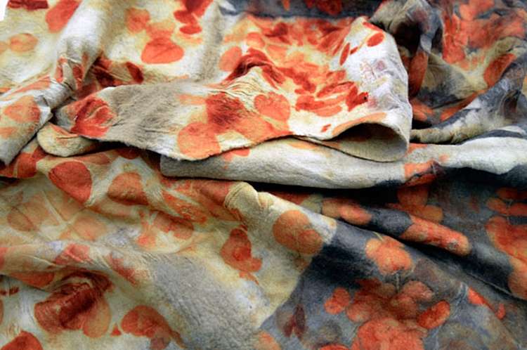 Da roher Wolletamine weit gewebt ist, eignet er sich hervorragend als Untergrund für feine, aber sehr stabile Nunofilze. Eine feine Kammzugauflage verbindet sich mit Wolletamine zu wunderschönen Nunofilzen, die sich sogar für Röcke eignen! Das Foto oben zeigt Nunofilze, die anschließend noch mit Eukalyptus bedruckt wurden.