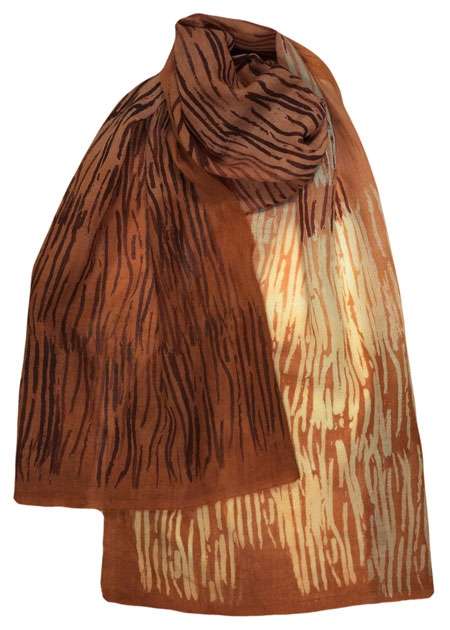 Ein Etamineschal wurde zunächst mit Säurefarben im Topf braun eingefärbt. Mit einer Siebdruckschablone haben wir die eine Hälfte mit dunklerer Farbe bedruckt (Mischung aus Entfärber und Dekaprint), die andere Hälfte nur mit Entfärbepaste.