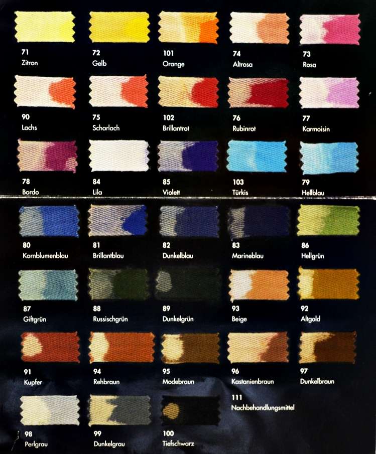Sogar in der Maschine lässt sich DEKA L Färben, aber das macht natürlich nur dann Sinn, wenn man mit den Großpackungen arbeitet. Wir bieten normalerweise nur die Tütchen an, freuen uns aber über Anfragen nach den großen Dosen (500g, für professionelle Anbieter). Im Wesentlichen ist der Ablauf nicht anders als bei Waschmaschinenfarben.