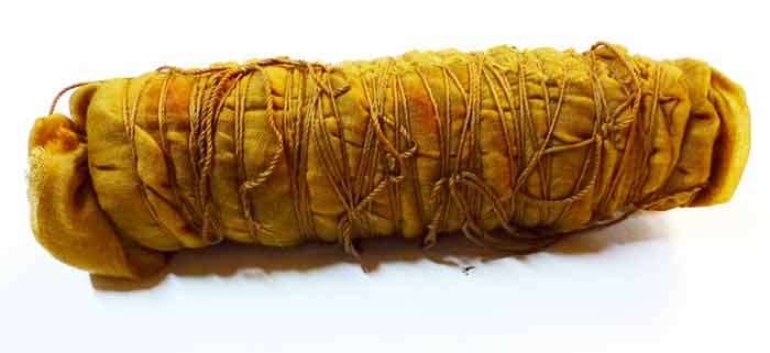 Der Stoff muss beim Belegen feucht sein und nach dem Belegen mit Blättern fest auf das Rohr gewickelt werden. Eine dichte und feste Schnürung trägt viel zum Erfolg des Druckes bei!
