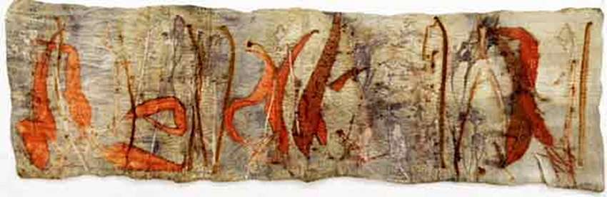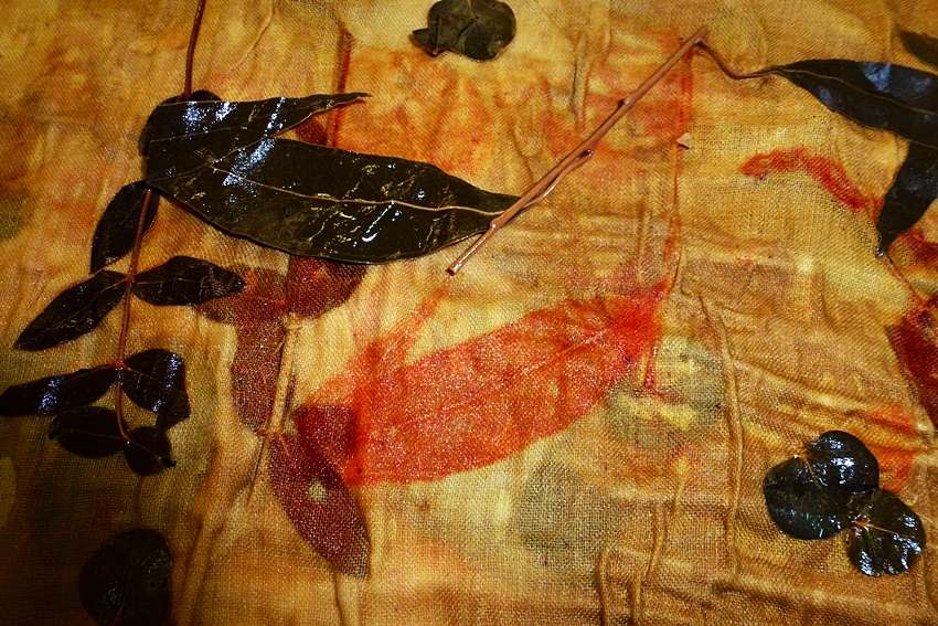 Rot färbender Eukalyptus ergibt als Ecoprint auf Wolle und Seide ohne Beize haltbare Drucke: Rot und Orange auf Wolle, Lachs auf Seide.