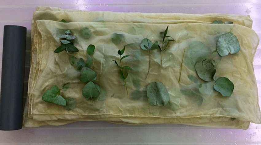 Ecoprints mit Eukalyptus werden im kochenden Wasserbad oder einem Farbbad fixiert. Da Eukalyptusblätter ihre Farbe nur sehr langsam abgeben, ist eine Kochzeit von mindestens 120 Minuten notwendig (längeres Kochen kann das Ergebnis noch verbessern).