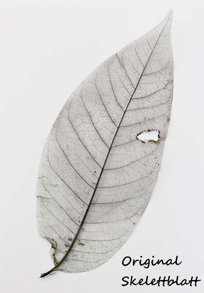 Vermutlich kennt ihr die zarten Blattgebilde, die dadurch entstehen, dass man mithilfe eines speziellen Verfahrens die weichen Anteile eines Blattes entfernt, sodass nur noch Stil und Gerippe übrig bleiben. Man nennt solch ein Blatt auch Skelettblatt oder skelettiertes Blatt.