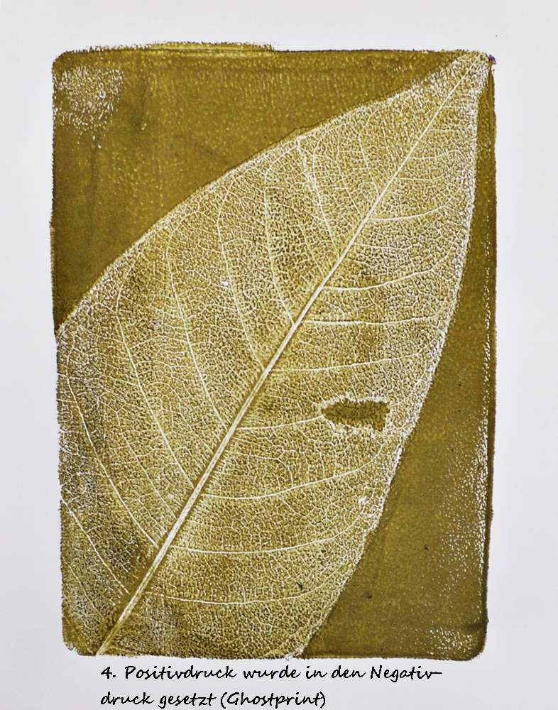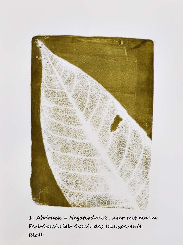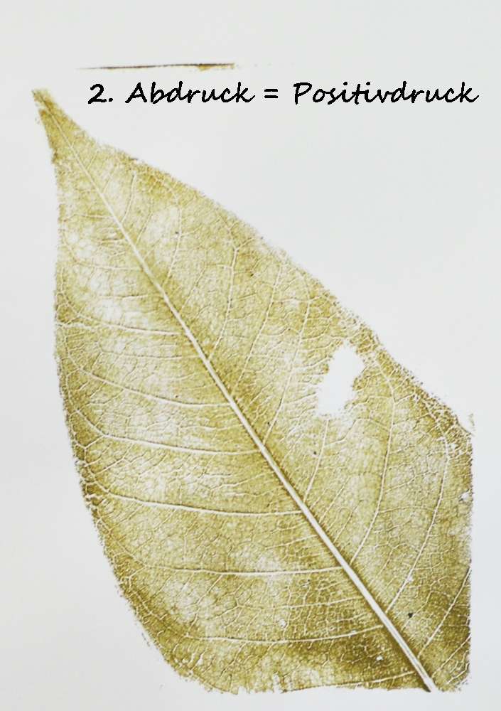 Nach dem Negativdruck wird das Skelettblatt abgehoben (sehr hilfreich dabei ist eine Pinzette), dann senkt man das Druckerpapier wieder auf die Platte und reibt den verbliebenen Positivdruck ab. Wieder prima gelungen.