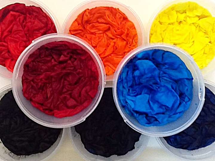 Das richtige Gefäß, nicht zu groß und nicht zu klein, ist eine wichtige Voraussetzung. Die oben gezeigten runden Vorratsdosen gab es vor vielen Jahren beim Möbelschweden. Sie sind von Größe und Form ideal für eine Färbung von Baumwollsatin ca. 50*50cm. Von dort aus setzen wir den Stoff nach etwa 1-2 Stunden mit möglichst wenig Bewegung in eine Plastiktüte (aber nur, wenn die Dosen direkt weiter verwendet werden sollen. Sonst belassen wir sie bis zum Auswaschen dort).
