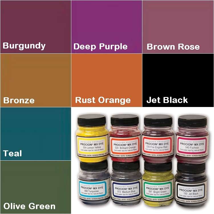 Es gibt verschiedene Hersteller für Procion MX, die alle dieselben Basisfarben verwenden, um ihre individuellen Mischfarben herzustellen. Der Hersteller JACQUARD, der sicherlich in Europa am stärksten vertreten ist, bietet in seiner großen Farbskala 12 Basisfarben an, sowie 31 gemischte Farbtöne.