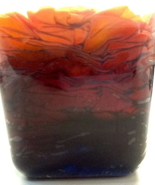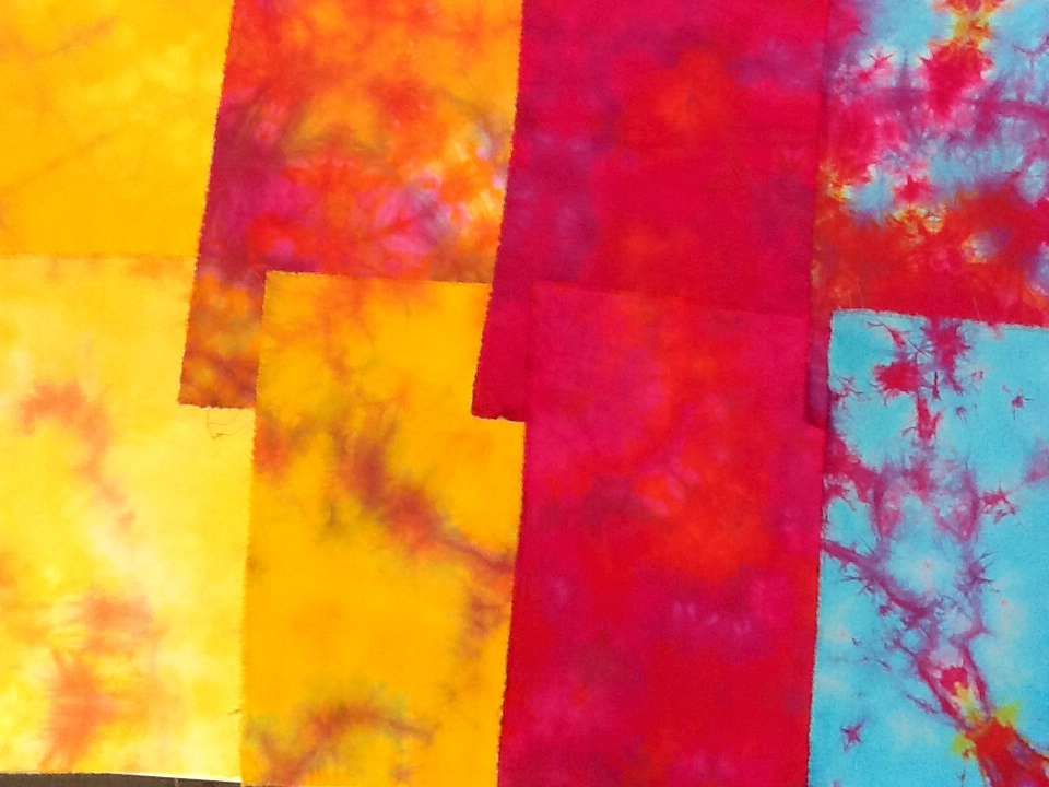 Es gibt noch eine weitere Methode, mit der sich selbst hergestellte Mischungen für tolle Splittingeffekte ergeben. Dazu braucht man ein hohes Gefäß, in das nacheinander feuchte, sodagetränkte Stoffstücke gepresst werden. Schritt-für-Schritt werden unterschiedliche gelöste Procion-Farben oder manchmal auch nur Sodawasser vorsichtig von der Seite her oder von oben her eingegossen, und zwar nur sehr wenig. Gleichzeitig wird mit der Hand (Handschuhe!) stark von oben gepresst. Es wird tatsächlich nur sehr wenig Farbe verbraucht bei gleichzeitig intensiven Färbungen (siehe zweites Bild von oben) – ein ideales Verfahren für Resteverwertung! Beim Beispiel oben hatte ich Goldgelb, Magenta und Türkis verwendet.