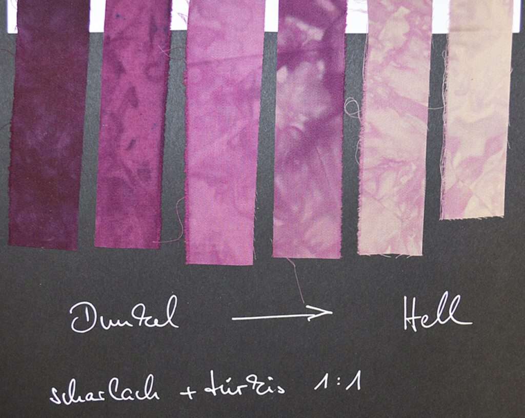 Lange Ruhezeit: Am besten, Stoff und Farbe haben ausreichend Zeit, sich miteinander zu verbinden. Auf alle Fälle über Nacht, gerne auch einen Tag länger. Vor allem bei Türkis ist das wichtig, aber auch für alle anderen Blautöne. Der Blaubereich wandert langsam, der Rotbereich dagegen besonders schnell und die Gelbtöne mittel schnell. Bei warmen und heißen Raumtemperaturen geht alles schneller, aber auch da solltest du dem Türkis seine Zeit geben.